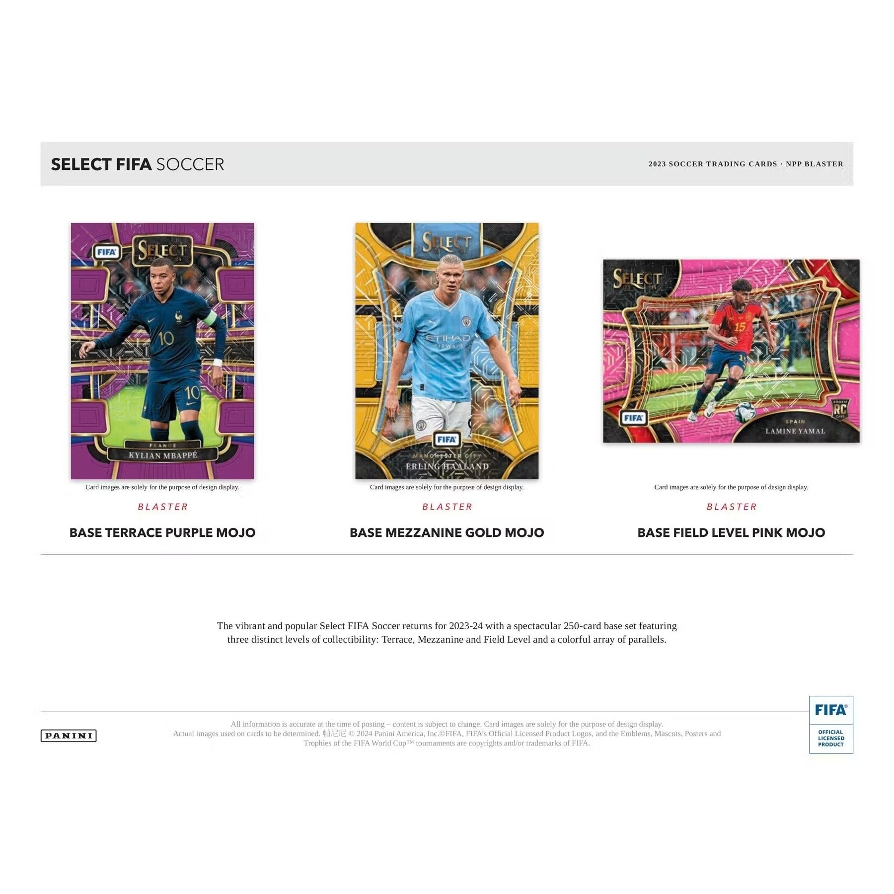 BASE: The popular Select FIFA Soccer collection is back for 2023-24, showcasing a spectacular 250-card base set with three unique levels of collectibility (Terrace, Mezzanine, and Field Level), and a range of eye-catching parallels. A great addition to any soccer or football trading card collection!