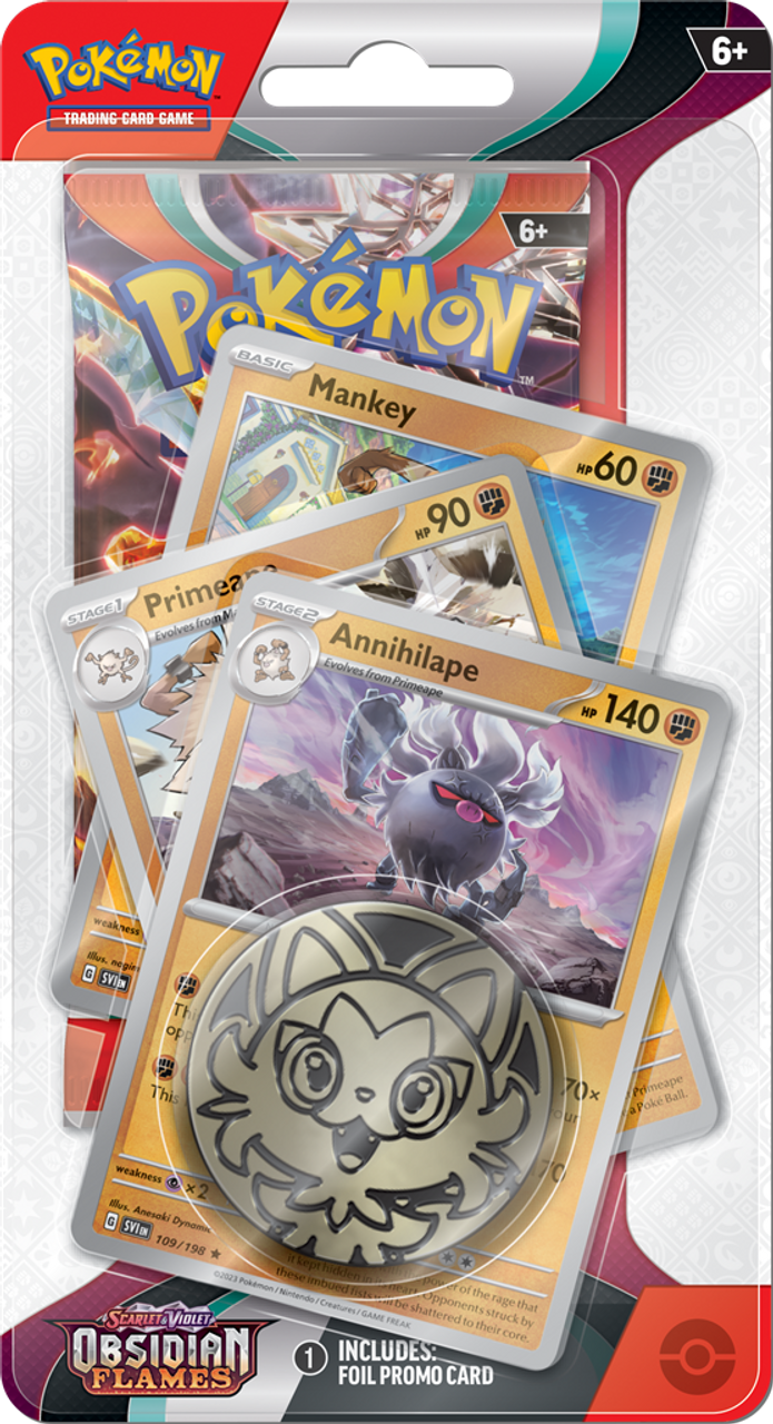 SV Obsidian Flames Premium Checklane Blister, comes with 1x SV Obsidian Flames Booster pack, a special flip coin, and the Annihilape Evolution line.