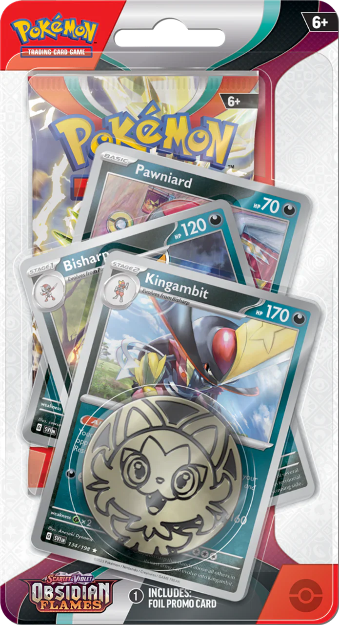 SV Obsidian Flames Premium Checklane Blister, comes with 1x SV Obsidian Flames Booster pack, a special flip coin, and the Kingambit Evolution line.