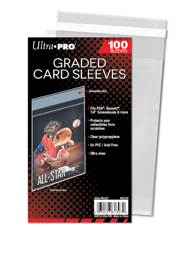 Ultra clear, archival-grade sleeve ideal for PSA, Beckett and 1/4" screwdowns. Keeps graded card and its holder clean and safe. Protects the graded card holder from scratches. Resealable strip allows for easy removal. 100 count per pack.